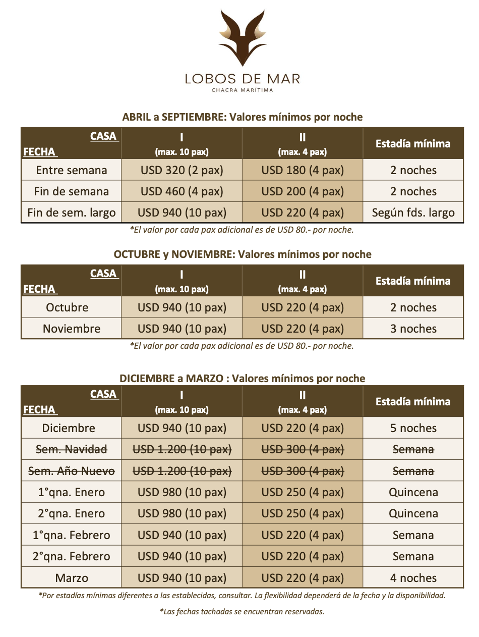 RESERVAS Y MODALIDAD DE PAGO: Las reservas se toman con un adelanto del 10% del monto total de la estadía -vía transferencia bancaria-. El saldo se abona en dólar billete al momento de la firma del contrato, a coordinar en CABA o GBA, en un plazo máximo de 15 días posteriores al pago de la reserva.